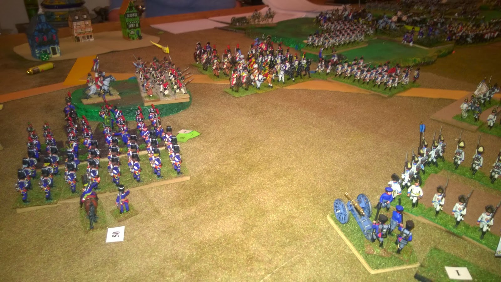 Scatta immediata la reazione della cavalleria di riserva francese che contrasta l'attacco e in pochissimo tempo si scontrano 6 reggimenti di cavalleria, lancieri della guardia, granatieri della guardia e lancieri di linea affrontano gli ussari, i lancieri di linea e i corazzieri austraici. Solo i dragoni a cavallo francesi e un reggimento di cavalleria pensate austriaca rimangono in riserva.